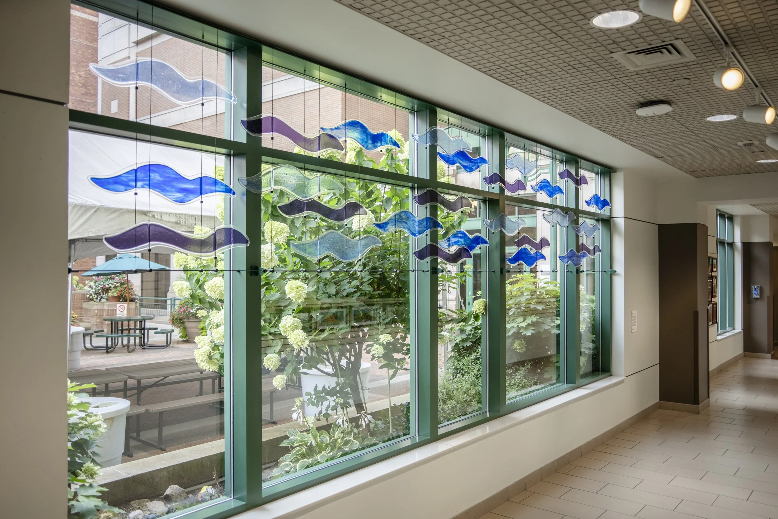 Moments of Serenity offers a quiet invitation: to pause, to breathe, to let the soft tones of color settle in. Installed in the West Entry hallway at UPMC Shadyside Hospital, this suspended sculpture is composed of 26 wave-shaped glass pieces in shades of violet, dark blue, and light blue. As people move along the corridor, the translucent colors shift and overlap, creating gentle rhythms of flow and stillness.
