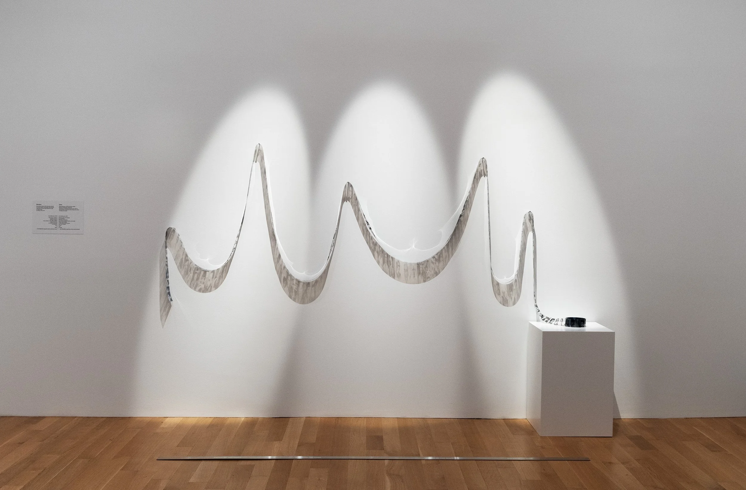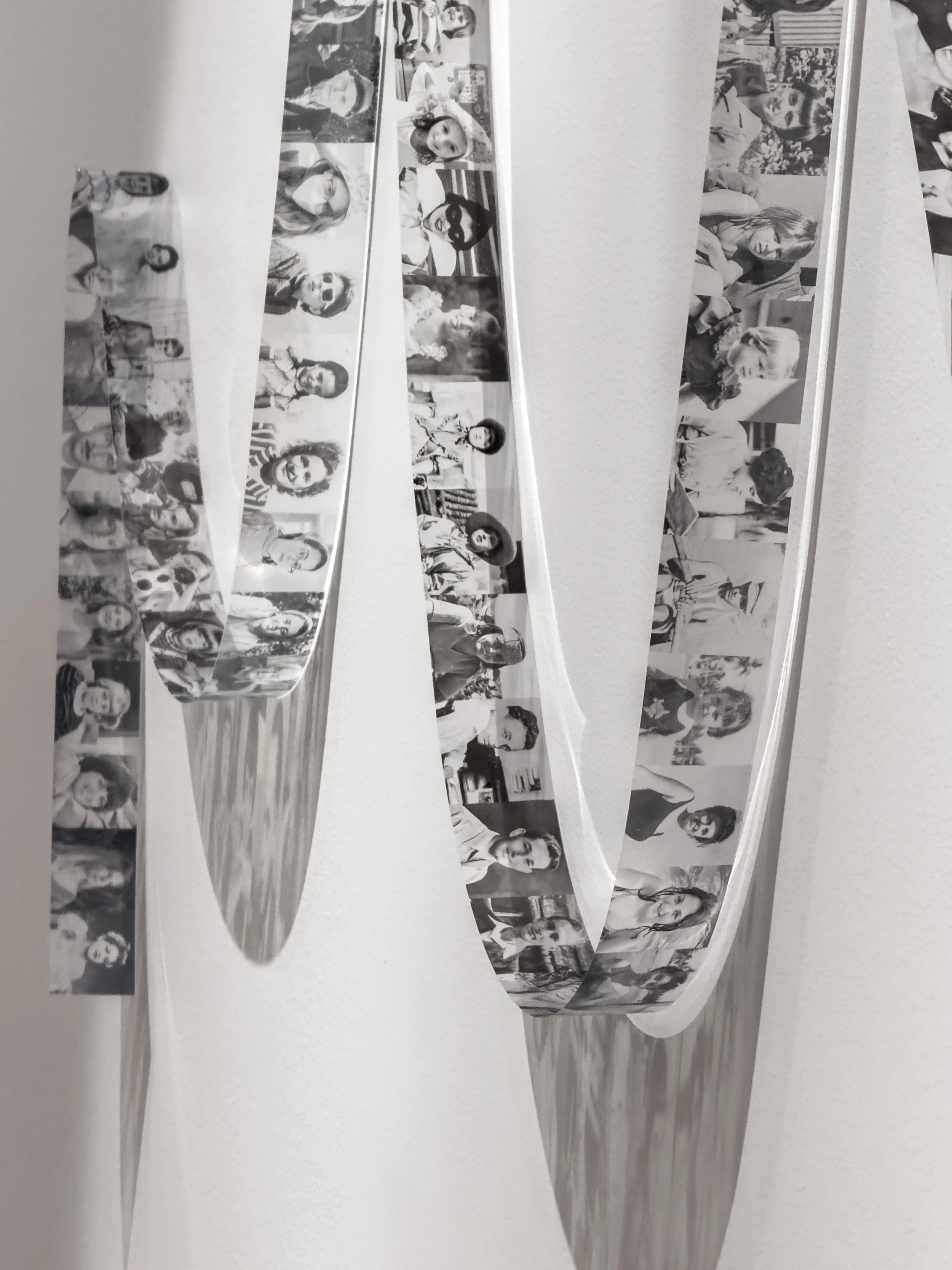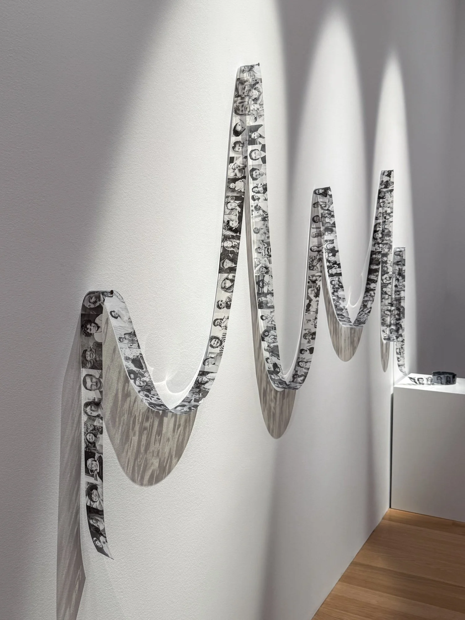 Entre (Between) features a 2' × 480' film strip composed of 240 family portraits. The shadows cast by overhead lighting explore the ephemeral nature of life and memory.